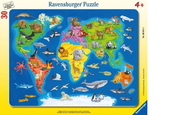 Kartonasta sestavljanka s 30 kosi. Sestavljanka ima motiv živali sveta. Skozi igro otrok spoznava katere živali so značilne za določene dele sveta in uri fino motoriko.