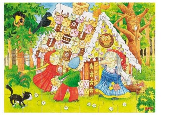 Lesena sestavljanka z 48 kosi z motivom pravljice Janko in Metka. Shranjeno v škatli.