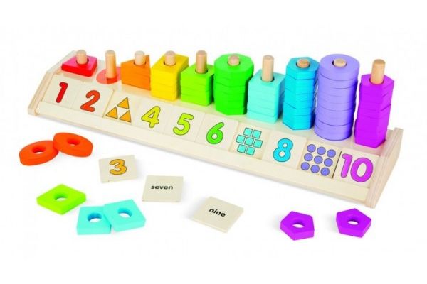 Komplet vsebuje petinpetdeset barvnih oblik (krog, kvadrat, trikotnik, pravokotnik, trapez,...) in deset številčnih ploščic za igro. Otrok med igro spozna barve, oblike, simbolično in kvantitativno vrednost števil do 10. Spodbuja fino motoriko in logično razmišljanje.