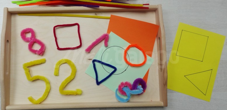 Na papir narišite različne oblike in števila. Naloga otroka je da poskuša iz žičke ponarediti obliko. Za otroke, ki še niso tako spretni lahko vi izdelate oblike in števila. Otrok pa poskuša ujemati izdelane oblike s predlogi na papirju.
